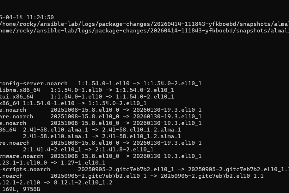 Ansible을 이용하여 Linux 업데이트 자동화 (5편) - RHEL 계열 패키지 변경 미리보기에서 이어지는 글이다. 5편에서는 --check --diff로 실행했을 때 RHEL 계열에서 어떤 패키지가 업그레이드, 설치, 제거되는지 미리 확인하는 방법을 다루었다.6편에서는 Debian/Ubuntu 계열과 RHEL 계열에서 ansible-playbook으로 업그레이드하는 과정에서 어떤 패키지가 업그레이드,… 더 보기 »Ansible을 이용하여 Linux 업데이트 자동화 (6편) - 패키지 변경 로그 기록