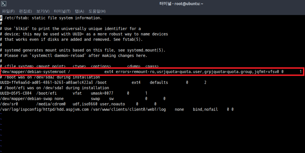외부 파일 기반의 quota를 사용 중이라면 usrjquota=quota.user,grpjquota=quota.group,jqfmt=vfsv0 옵션이 들어 있을 수 있다. 이 부분을 제거하고 아래와 같이 수정하면 된다.