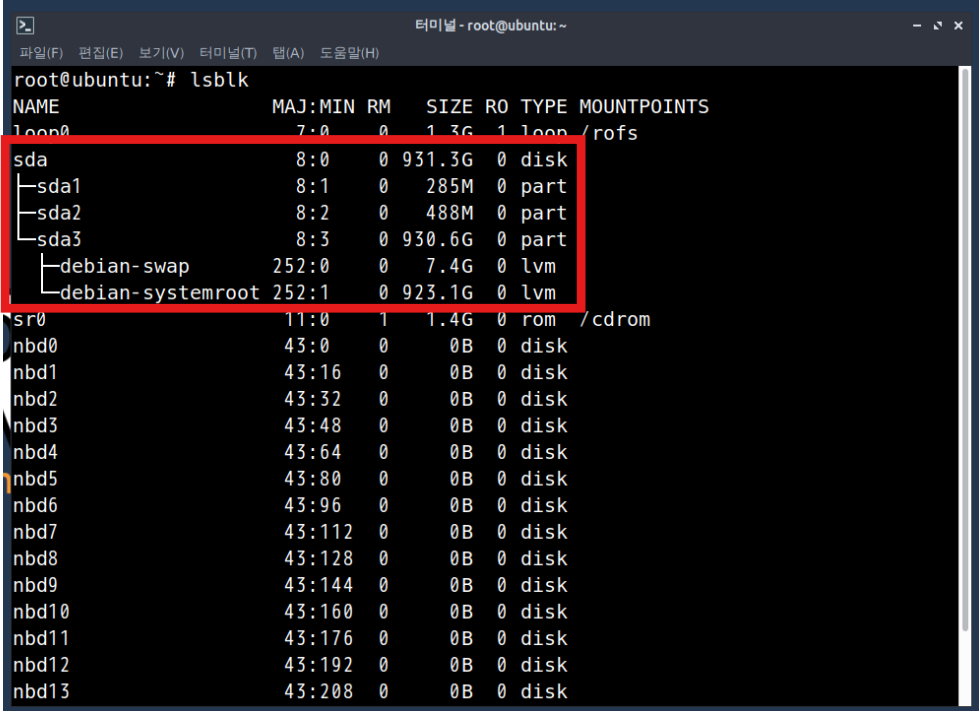 lsblk 명령어로 디스크의 파티션 이름을 확인한다.