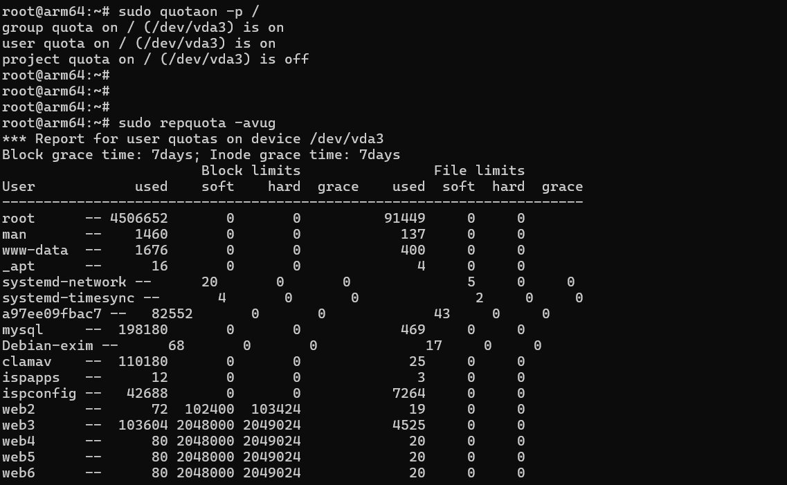 이는 ISPConfig에 저장된 웹사이트별 quota 값이 Linux quota에 다시 반영되지 않았기 때문이다.