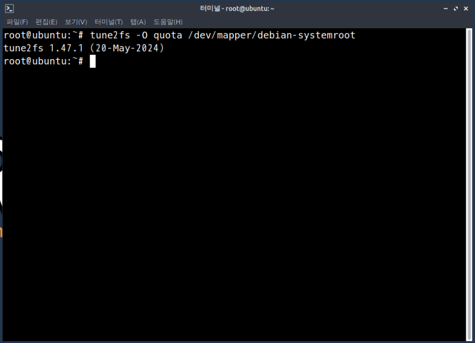 위처럼 나와야 한다. 모두 off로 표시된다면 ext4 quota feature 전환이 제대로 적용되지 않았을 가능성이 있으므로, 전환 절차와 fstab 설정을 다시 점검하는 것이 좋다.