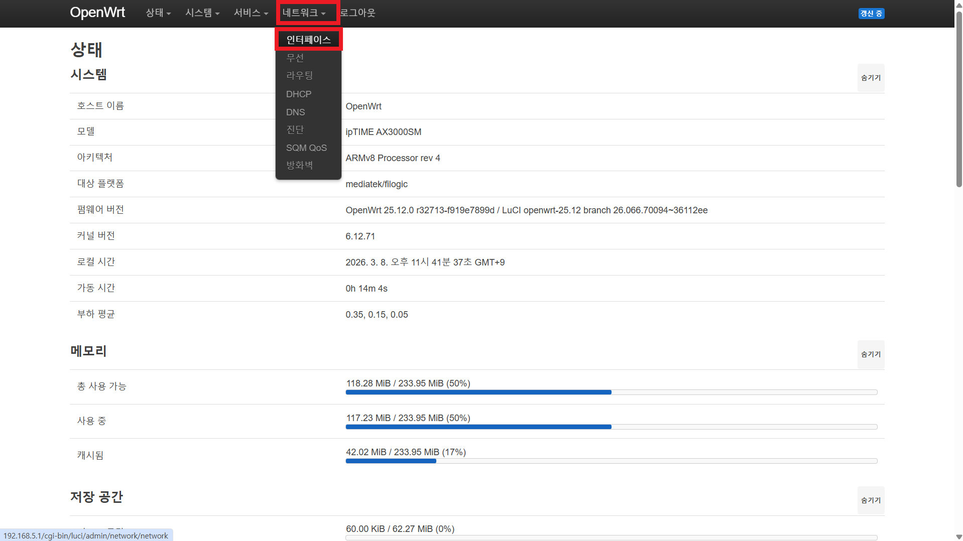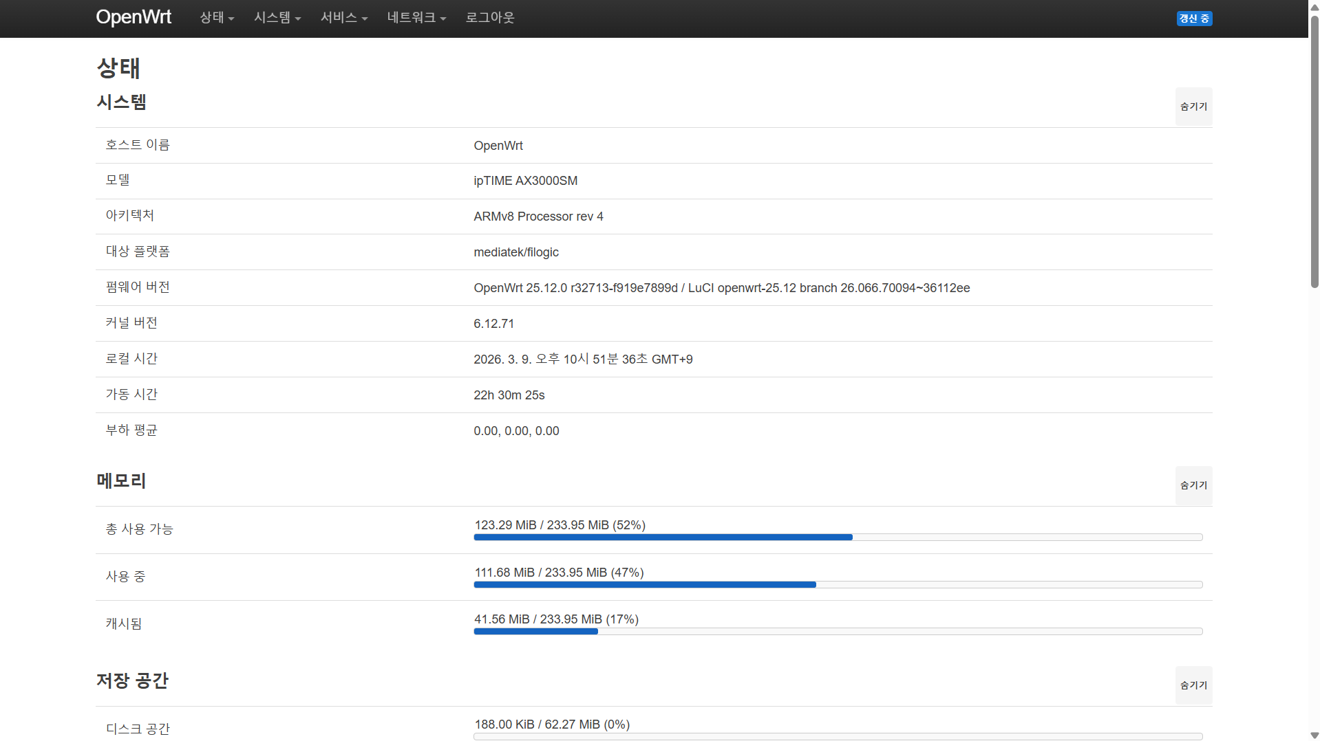 26년 2월에 ipTIME AX3000SM에 OpenWrt 24.10을 설치해서 사용 중이다. 처음 OpenWrt를 사용하는 것이어서 설정 난이도가 어려울 것이라 생각했다.