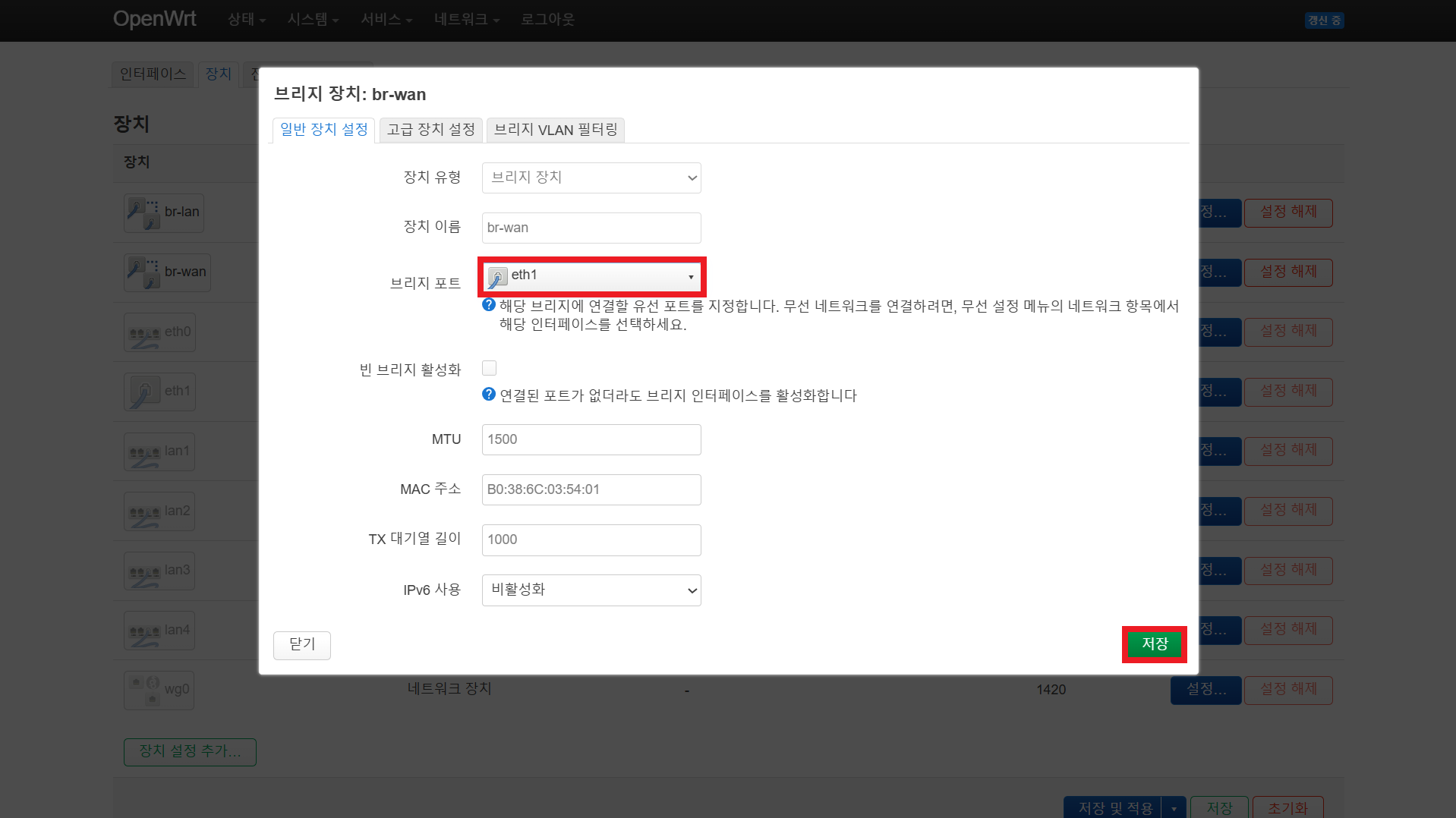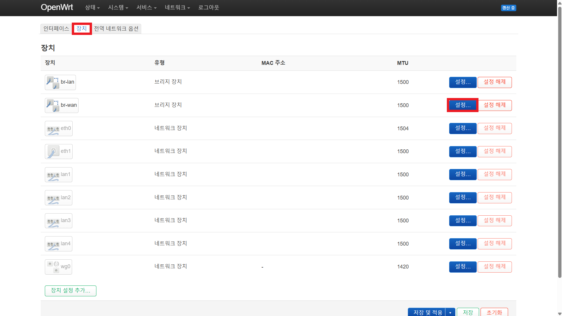 장치 > br-wan의 설정을 누른다.