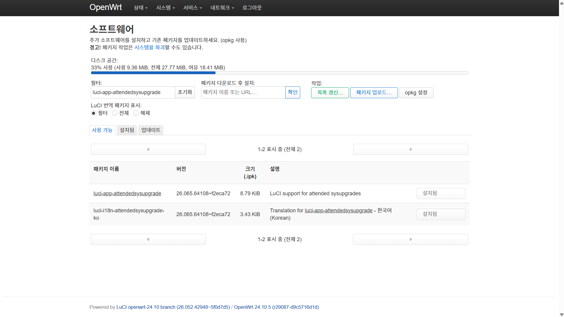 시스템 > 소프트웨어에서 luci-app-attendedsysupgrade를 설치한다.