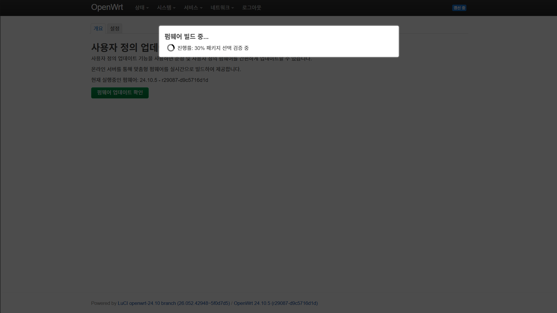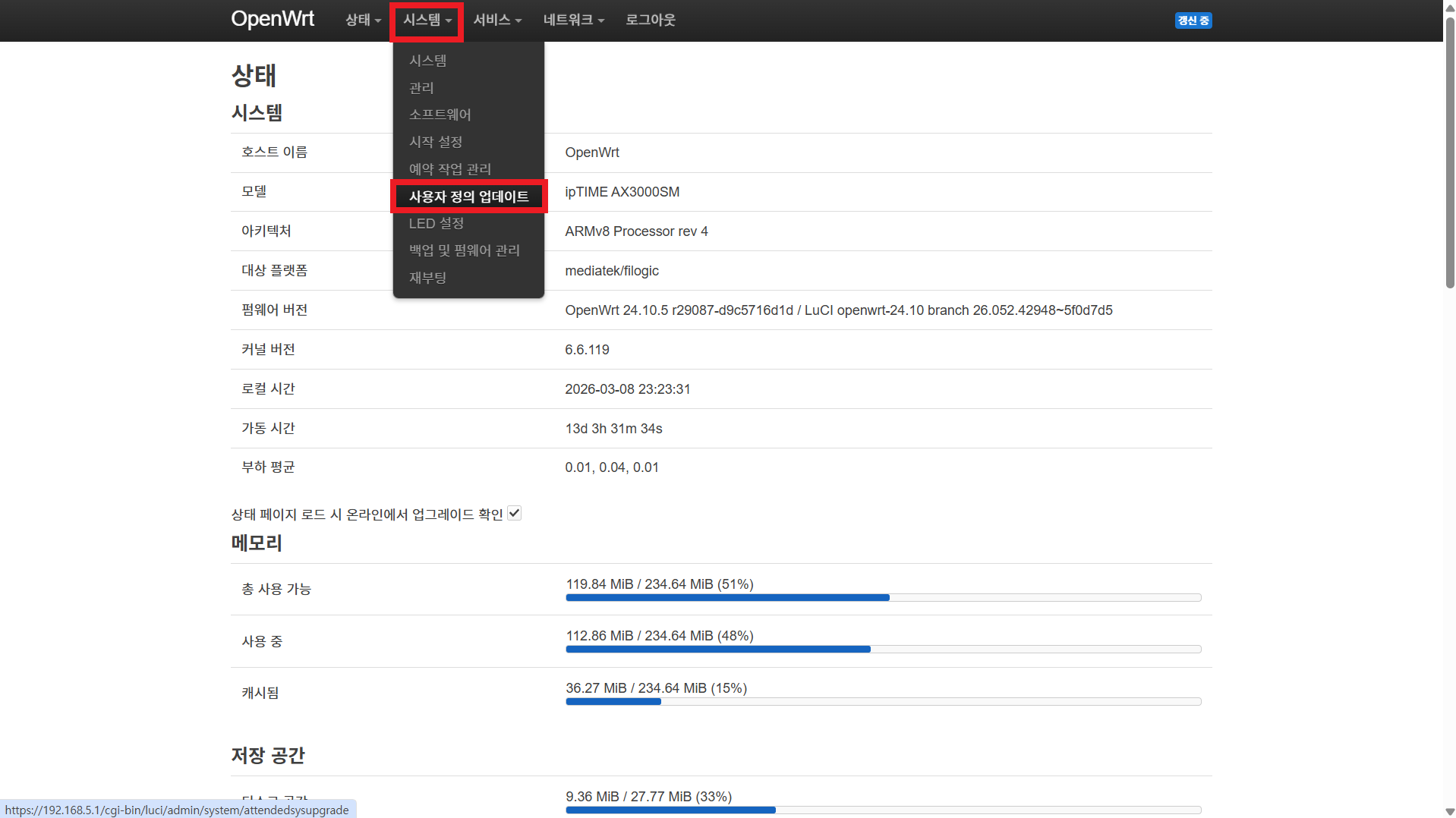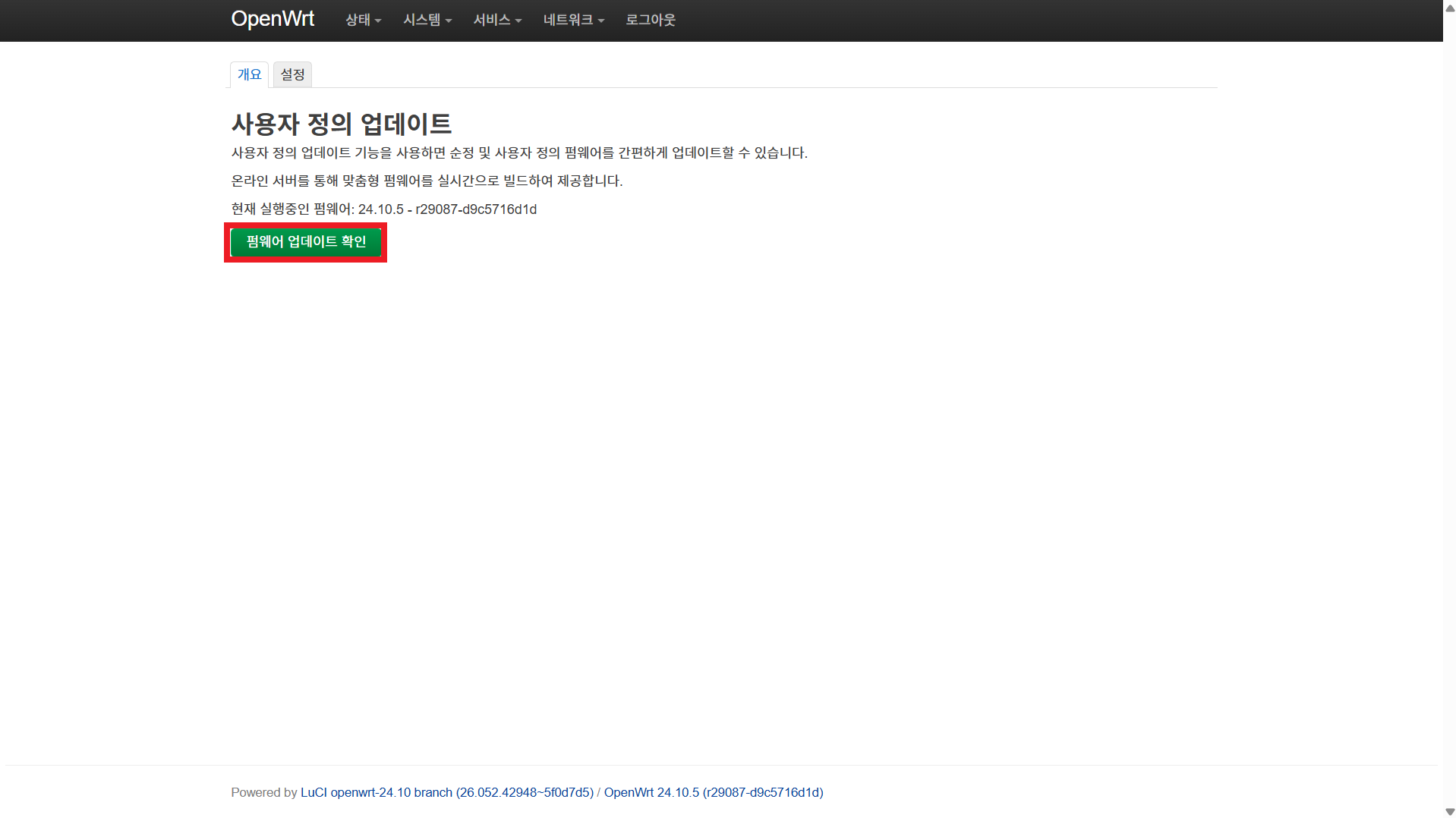 시스템 > 사용자 정의 업데이트 클릭, 펌웨어 업데이트 확인을 클릭한다.