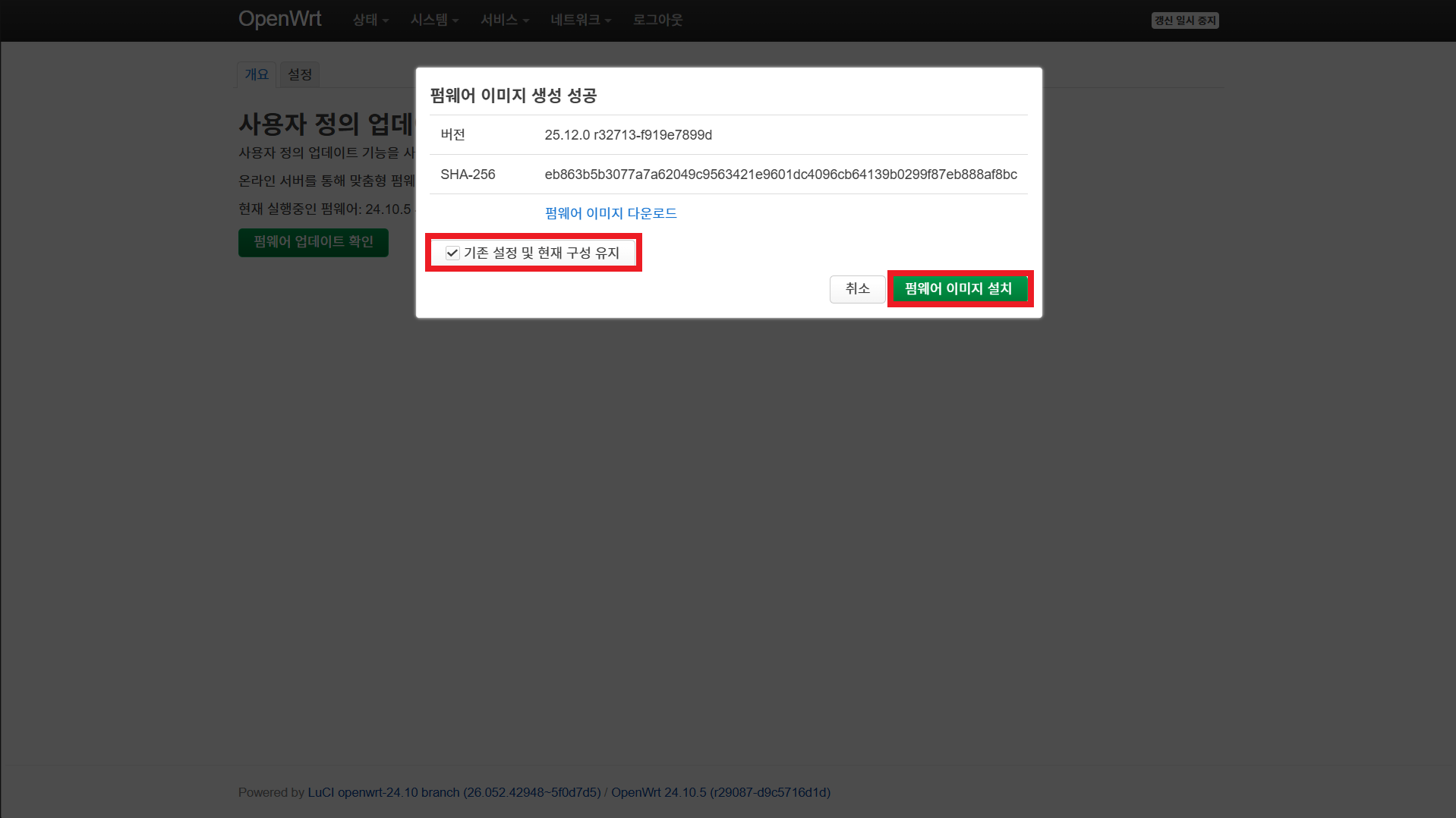 기존 설정, 패키지 등을 유지한 채 업그레이드하려면 기존 설정 및 현재 구성 유지를 체크한 뒤 펌웨어 이미지 설치를 누른다.