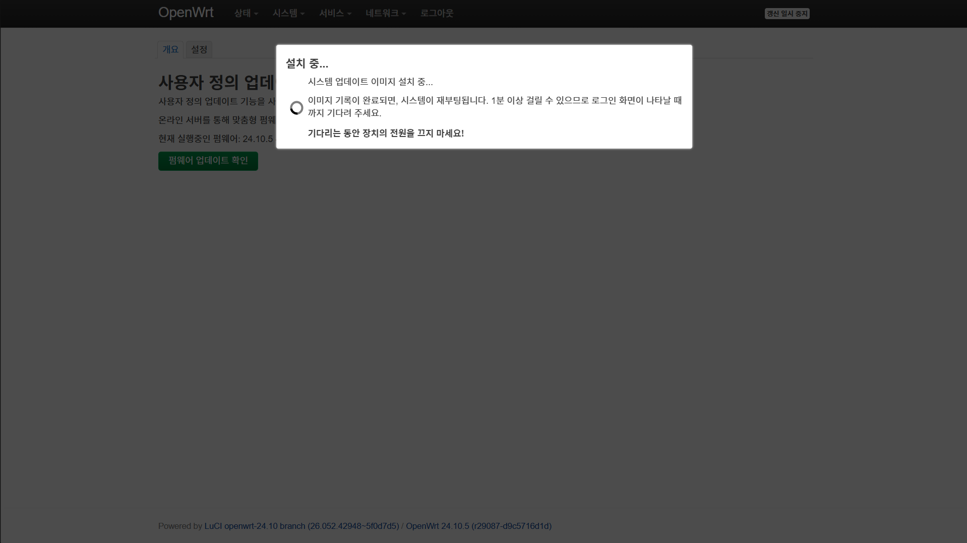 4. 업그레이드 과정이 10분 넘게 지속되다. (WAN 포트 연결 안 됨, LuCI 접속 불가)